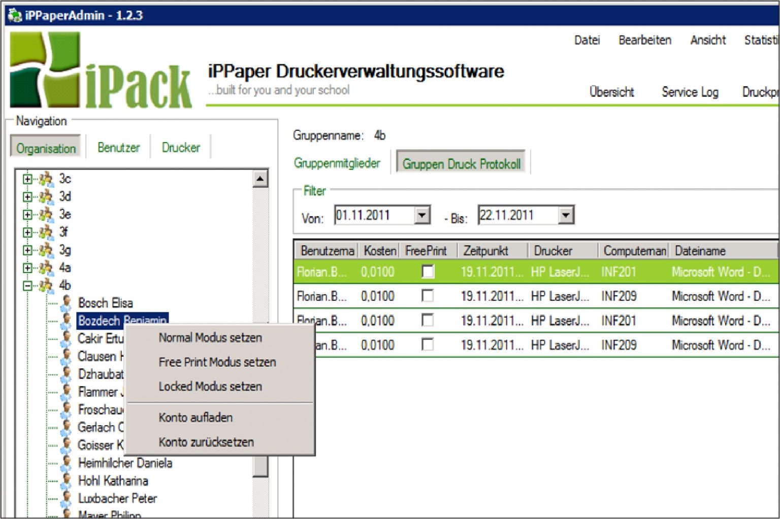 Mit iPPaper kontrollieren Sie Ihre Druckaufträge im Netzwerk und können feststellen, wer, wann auf welchem Drucker ausgedruckt hat. Dabei ordnen Sie jedem einzelnen Drucker individuelle Seitenkosten und danach einzelnen/mehreren/allen Usern in Ihrer Domäne ein fiktives Druckkonto zu. Sollte ein Druckkonto aufgebraucht sein, so kann bzw. wird, wenn dies eingestellt wurde, dem betreffenden Benutzer das Drucken im Netzwerk verweigert.
